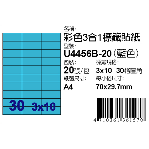 Dr.Paper 70x29.7mm NO.30-U4456B-20 30格 藍 A4 雷射噴墨影印自黏標籤貼紙/電腦標籤 20大張入