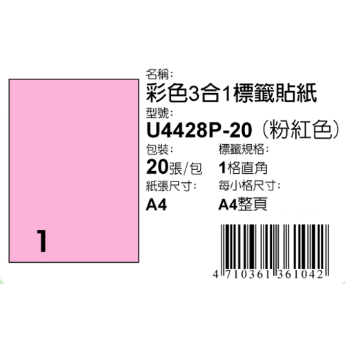 Dr.Paper NO.1-U4428P-20 全張 粉紅 A4 雷射噴墨影印自黏標籤貼紙/電腦標籤 20大張入
