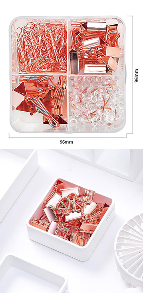 得力Deli玫瑰金4格文具組/78551/長尾夾+迴紋針+美式圖釘