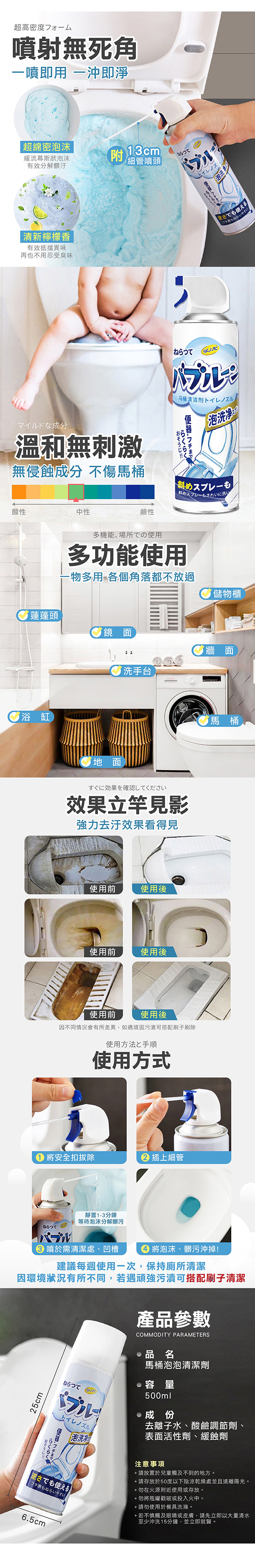 ✔殺菌除味,快速分解✔強力清潔,消臭留香✔溫和無刺激、無腐蝕 【使用方法】1.使用前請先均勻搖一搖2.均勻噴在馬桶有髒汙的地方3.用刷具刷過髒污4.清水沖過 乾淨如新 【商品規格】商品名稱:馬桶泡泡清潔劑商品含量:500ml ⚠注意事項1.請放置於兒童觸及不到的地方2.請遠離火源及高溫的地方存放3.本品用途以外,請勿使用 詳細參數容量:500ml