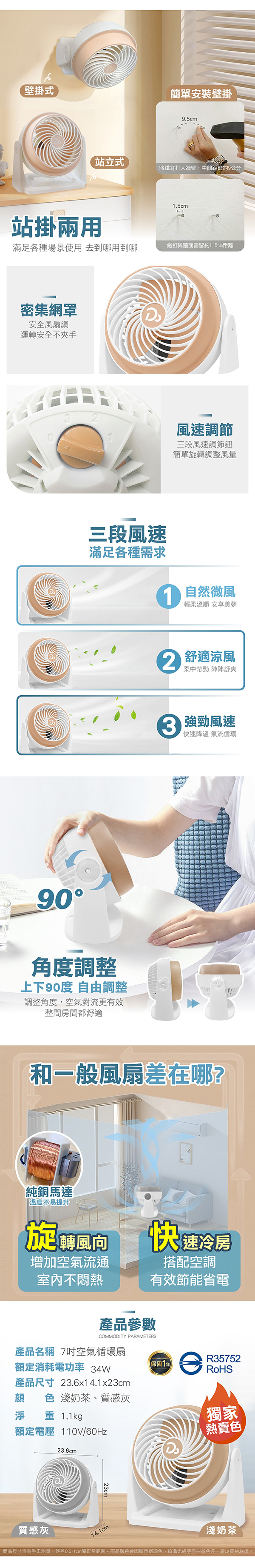 7吋渦流循環扇 7吋輕巧大小 三段風速調節 上下仰俯角度調整 詳細參數電壓:110V/60Hz 功率:34W 尺寸:23.6x14.1x23cm 淨重:1.1kg BSMI:R35752 產品責任險:151612PD01122