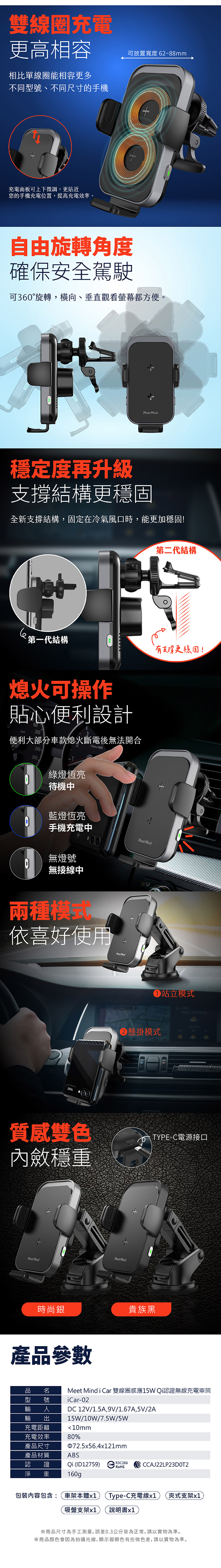 品 名: MeetMindiCar 雙線圈感應15WQi證無線充電車架