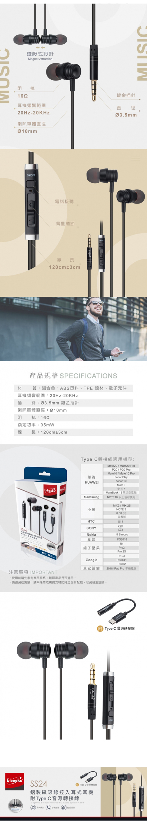 ‧磁吸式設計,不使用時可互相吸附防止脫落。‧內建接聽鍵 / 附音量調節器 / 隱藏式麥克風。‧適用單插孔筆電、智慧手機、平板、MP3…等。‧支援Android/iOS系統之智慧手機麥克風接聽功能 (iphone 7 以上需搭配轉接線)。加贈Type C轉接線