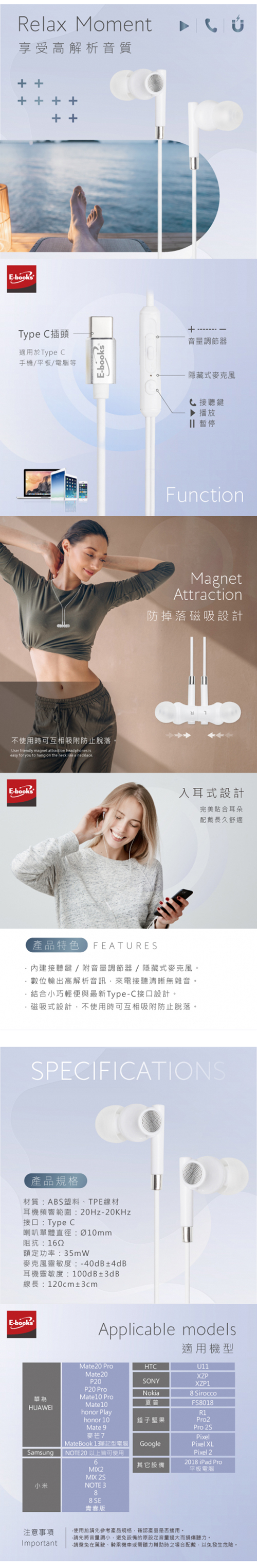 ‧內建接聽鍵 / 附音量調節器 / 隱藏式麥克風。‧數位輸出高解析音訊,來電接聽清晰無雜音。‧結合小巧輕便與最新Type-C接口設計。‧磁吸式設計,不使用時可互相吸附防止脫落。‧內建接聽鍵 / 附音量調節器 / 隱藏式麥克風。‧適用單插孔筆電、智慧手機、平板…等Type-C接口。