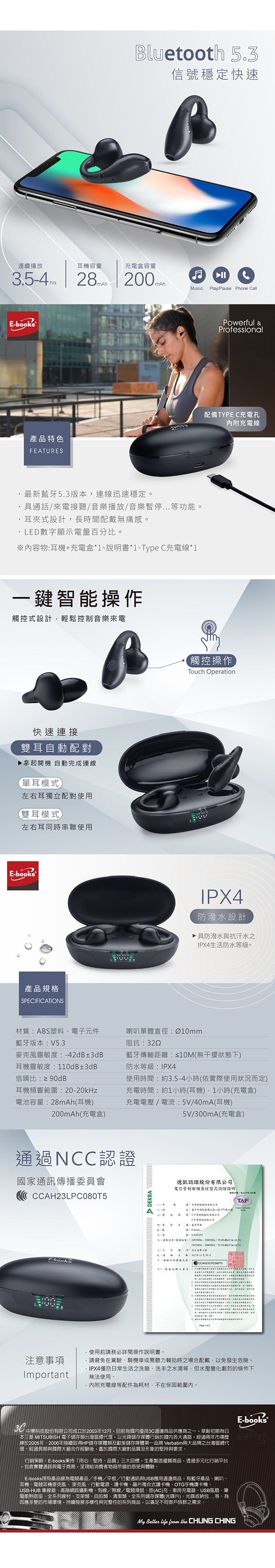 .充電電壓 / 電流:5V/40mA(耳機);5V/300mA(充電盒)
