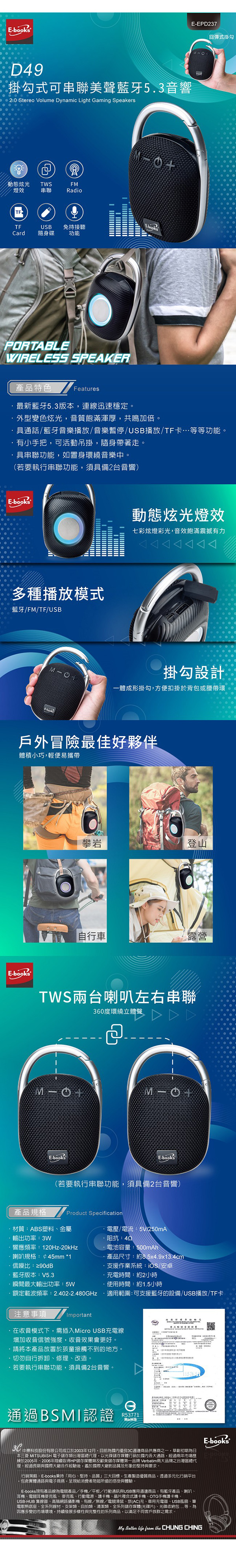 E-books D49 掛勾式可串聯美聲藍牙5.3音響