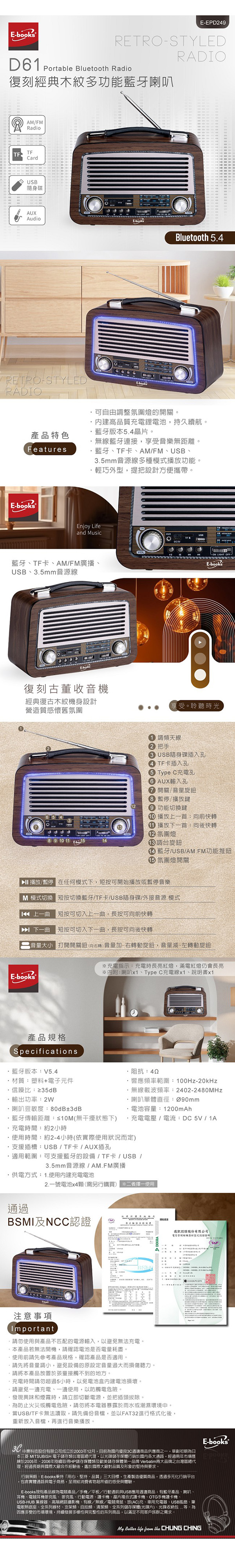 E-books D61 復刻經典木紋多功能藍牙喇叭