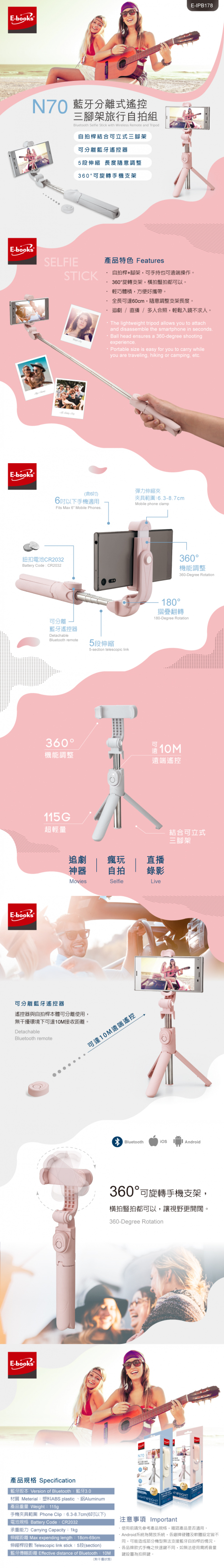 ‧ 自拍桿+腳架,可手持也可遠端操作。