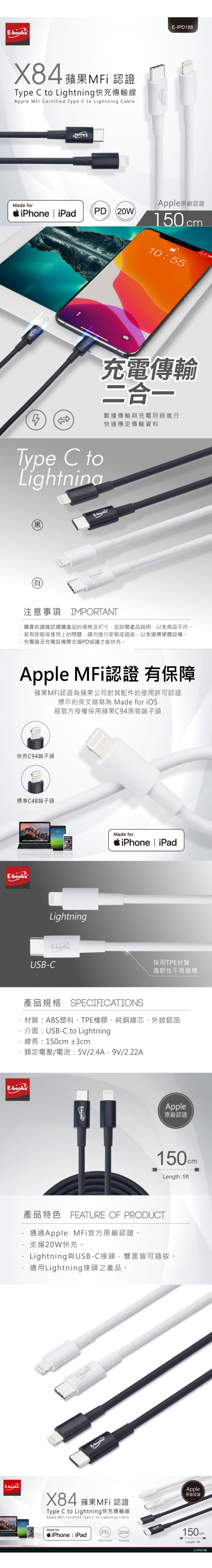 E-books X84 蘋果MFi 認證Type C to Lightning快充傳輸線1.5M-白