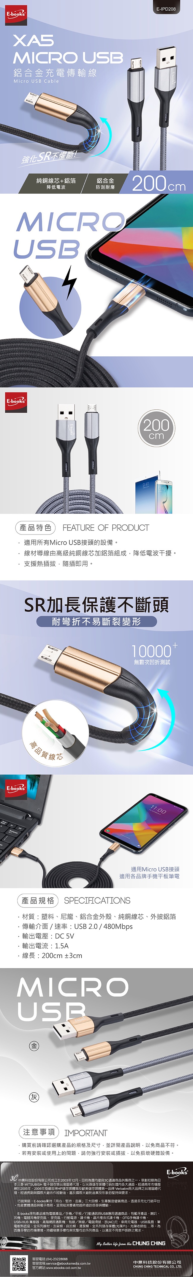 產品規格說明.材質:塑料、尼龍、鋁合金外殼、純銅線芯、外披鋁箔.傳輸介面 / 速率:USB 2.0 / 480Mbps.輸出電壓:DC 5V.輸出電流:1.5A.線長:200cm ±3cm特色說明.適用所有Micro USB設備。.線材導線由高級純銅線芯加鋁箔組成,抗氧化,降低電波干擾。.支援熱插拔,隨插即用。