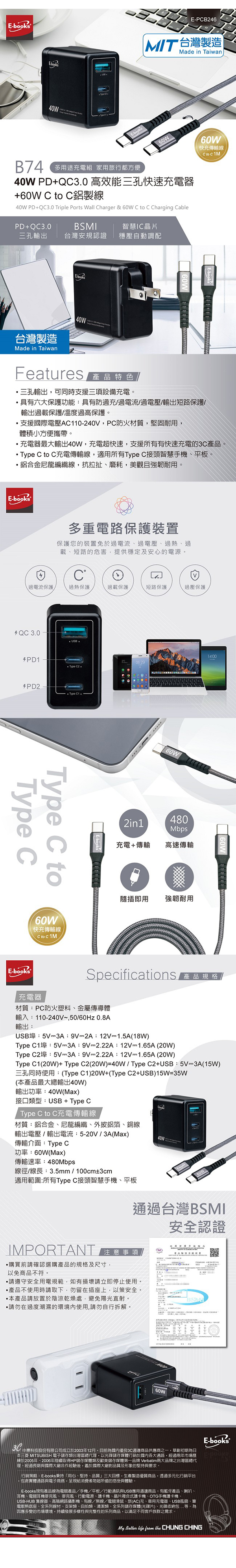 E-books B74 40W PD QC3.0 高效能三孔快速充電器 60W C to C鋁製線
