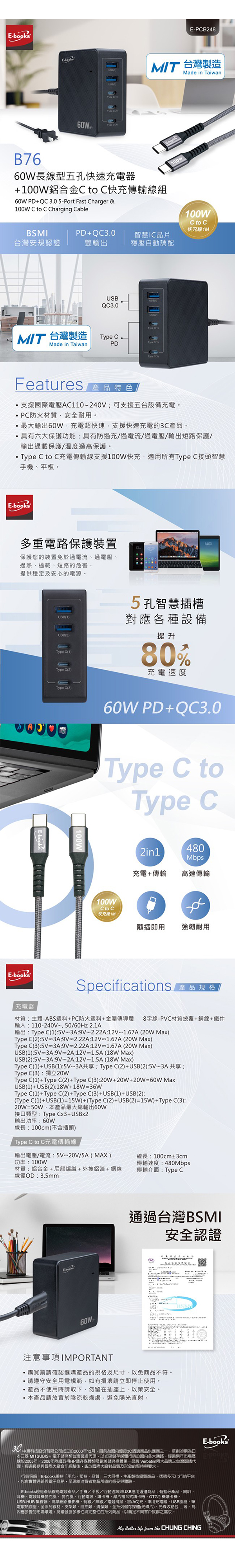 .BSMI驗證號:R56722,檢磁型號:E-PCB248.支援國際電壓AC110~240V;可支援五台設備充電