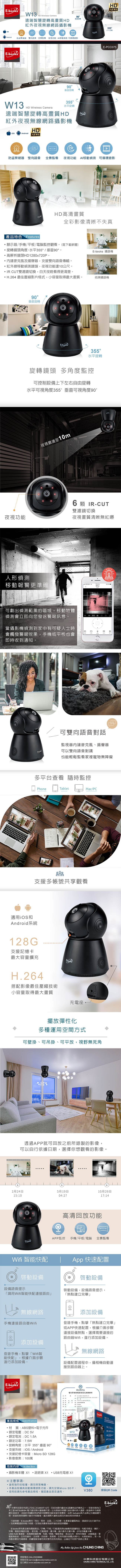 HD高清畫質/防盜警報器/紅外夜視功能/可循環錄影/AI移動偵測/全景監看/雙向語音 下載APP軟體: V380