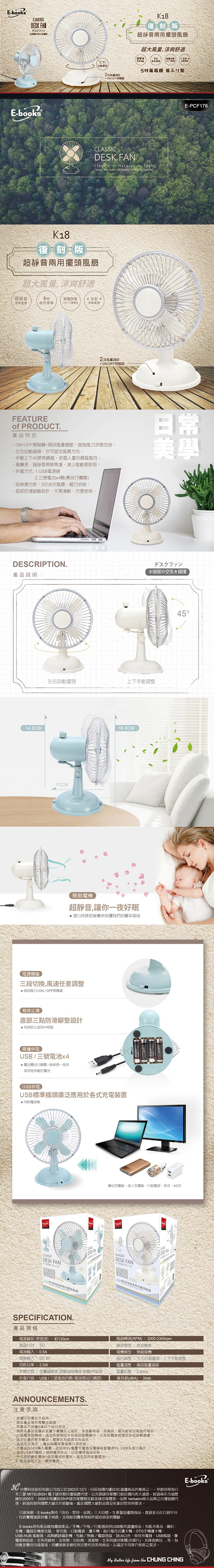 · 超靜音無刷電機/左右自動擺頭/5吋迷你風扇/USB與電池兩種供電方式