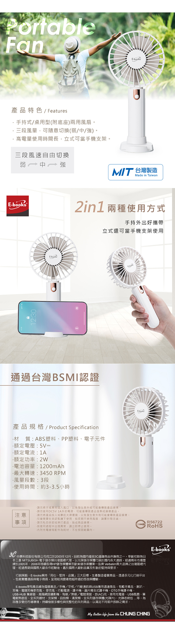 .手持式/桌用型(附底座)兩用風扇。