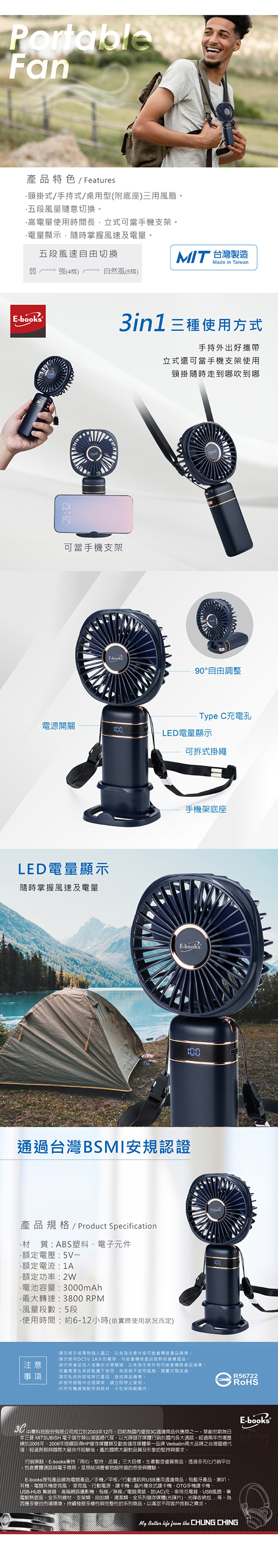 .頸掛式/手持式/桌用型(附底座)三用風扇。