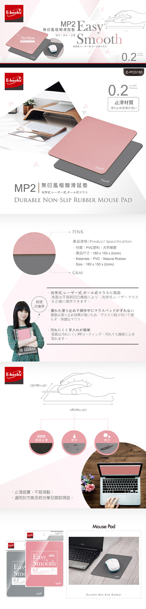 產品規格.顏色:粉/灰.材質:PVC塑料、天然橡膠.產品尺寸:180 x 150 x 2(mm) 產品特色.防滑底層,不易滑動。 .適用於市售多款光學及雷射滑鼠。若需指定顏色、可先詢問庫存數量是否足夠.如需訂貨約等候1~3天方可出貨(不含例假日)。