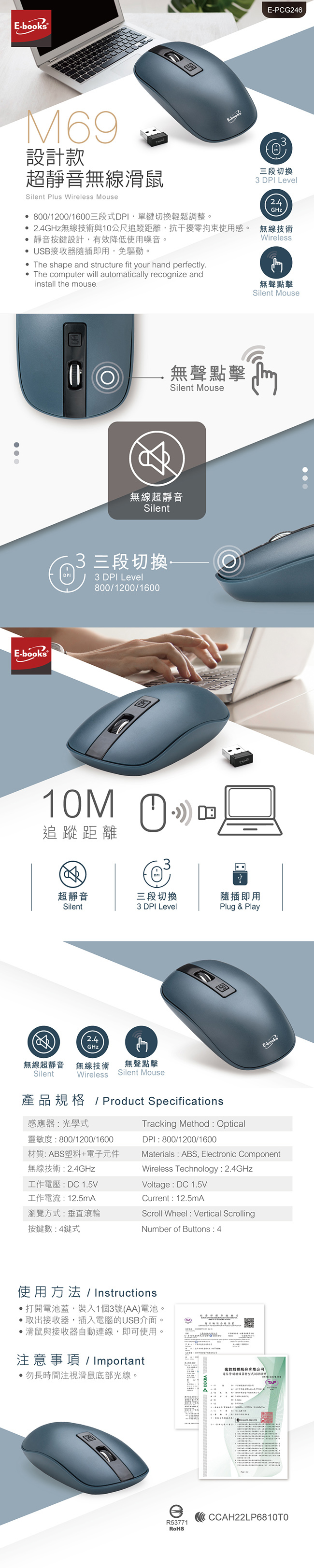 2. 2.4GHz無線技術與10公尺追蹤距離,抗幹擾零拘束使用感。