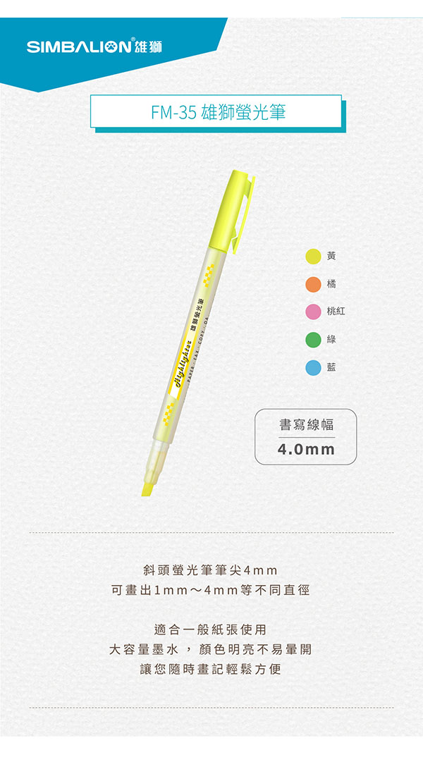產品特色 斜頭螢光筆筆尖4mm,可畫出1mm~4mm等不同直徑,讓您想畫粗線就畫粗線、想畫細線就畫細線,運用自如! 產品說明 雄獅螢光筆,適合一般紙張使用,包括:傳真紙、影印紙、課本、參考書……等等都適用,墨水不暈開,顏色不變髒,大容量墨水長時間可使用,讓您隨時畫記、輕鬆方便!