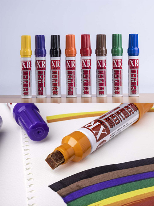 利百代 900-XR 油性特大號嘜克筆,採用3~12.5mm的寬平方尖筆尖──特粗筆畫,筆觸可展現由特粗到中到細的變化,筆尖寬平持筆特別穩定,最適合繪製大型POP、寫大字不用反覆描摹,一筆就可搞定,方便又有效率。紅、橙、黃、綠、藍、紫、茶、黑8種鮮明色彩,不但防水更不會褪色,最適合繪製大型戶外活動現場海報與POP,是美工設計、賣場陳列與公關活動企劃人員的最佳拍檔。