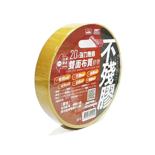 規格:20mmx6.5M/ 個貨號:41207包裝:單一包裝材質:布、特殊膠水使用方法:先將被黏貼面擦拭乾淨,清除汙漬與灰塵,進行按壓貼合。產品特色:雙面黏性的雙面布質膠帶使用不殘膠的材質製作,適用於室內外各種環境,海報張貼、廣告背板、地毯固定等多種用途。產地:台灣