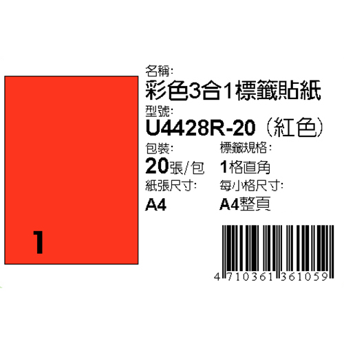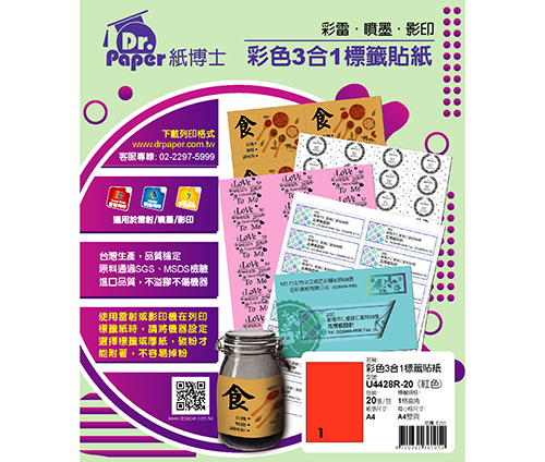 Dr.Paper NO.1-U4428R-20 全張 紅 A4 雷射噴墨影印自黏標籤貼紙/電腦標籤 20大張入