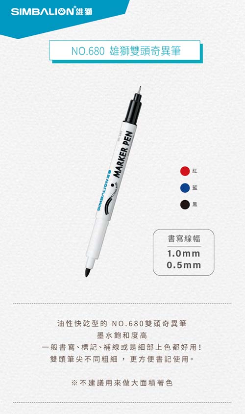 奇異筆的墨水飽和度比較高,屬油性快乾型,用以一般書寫、標記、補線或是細部上色都相當好用,但是不建議用來做大面積著色。雙頭筆尖不同粗細更方便書記使用。