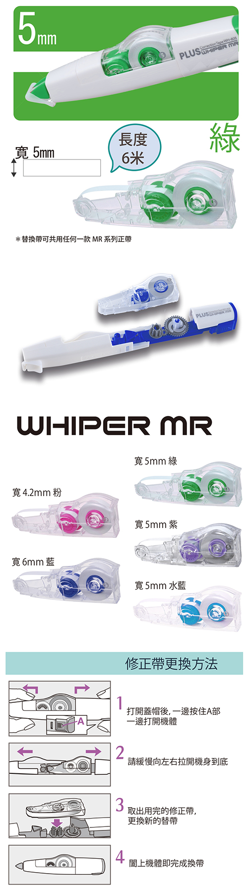 PLUS 普樂士 42-105 智慧型滾輪 修正帶/立可帶 補充內帶 5mm 綠 WH-605R