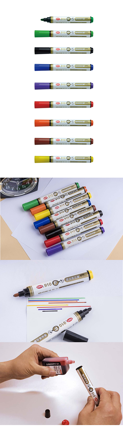 專為學生族群與美工人員設計,百分百由台灣環保認證廠商製造,符合歐盟認證標準!採用不含二甲苯的酒精性墨水,不僅無毒安全可在任何固體表面書寫,適用性極廣且對環境極為友善,非常適合經常接觸的重度使用者。墨水用完還添購專用補充液,一瓶可補充10次以上,既經濟又實惠。 這款價格親民的嘜克筆為1.5mm~3.0mm中圓尖筆尖,涵蓋最常使用的粗細範圍,一支可抵多支!並有藍、黑、紅、橙、黃、綠、茶、紫等8種色彩可供選擇,是寫POP、手繪海報的最佳利器。