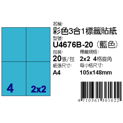 Dr.Paper 105x148mm NO.4-U4676B-20 4格 藍 A4 雷射噴墨影印自黏標籤貼紙/電腦標籤 20大張入