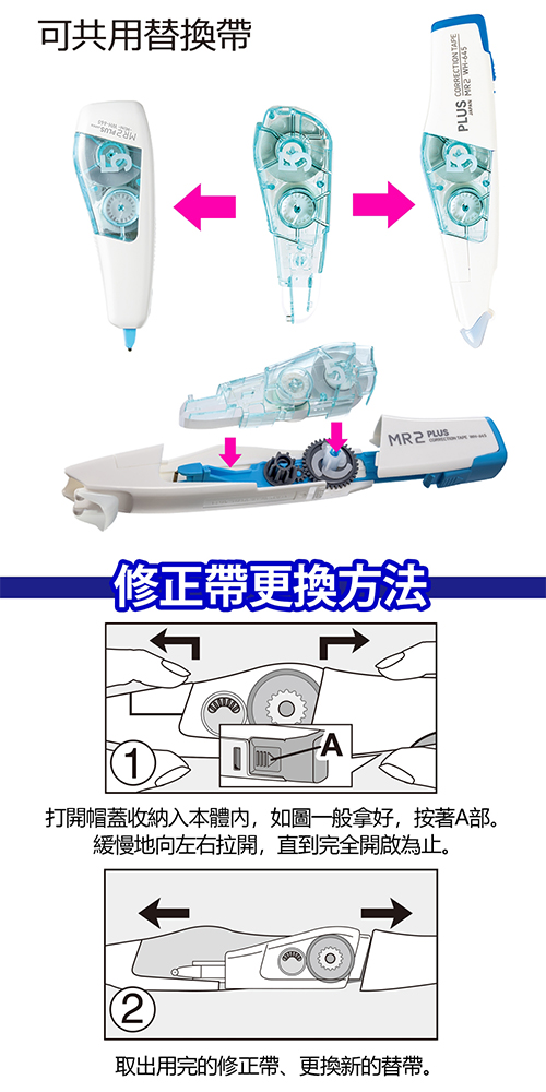 6.MR2修正帶不可與MR修正帶(WH-604系列、WH-634系列、WH-626系列)共用機殼與替換帶