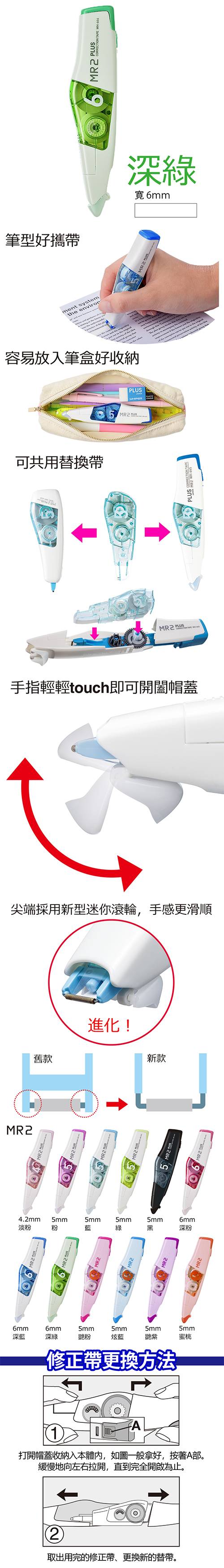 商品介紹1.銷售第一 全新進化 尖端更耐用。2.全新包覆的彈力蓋,手指輕輕touch即可開闔帽蓋。3.隨意自由組合,可與MR2修正帶、MR2麻吉帶、MR2標記帶共用機殼與替換帶。4.請購買MR2專用替換帶。5.規格:6mm×6M。6.MR2修正帶不可與MR修正帶(WH-604系列、WH-634系列、WH-626系列)共用機殼與替換帶。