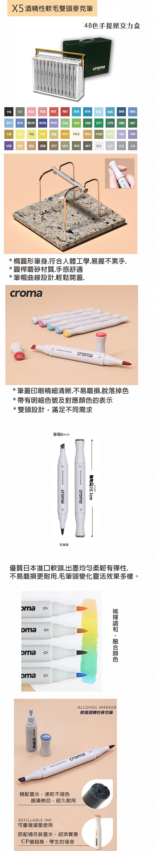 * 高級全透明壓克力48色手提盒* 酒精性軟毛雙頭麥克筆*優質日本進口軟頭.出墨均勻柔韌有彈性.不易磨損更耐用.毛筆頭變化靈活效果多樣。* 橢圓形筆身.符合人體工學.易握不累手.* 圓桿磨砂材質.手感舒適* 筆帽曲線設計.輕鬆開蓋.
