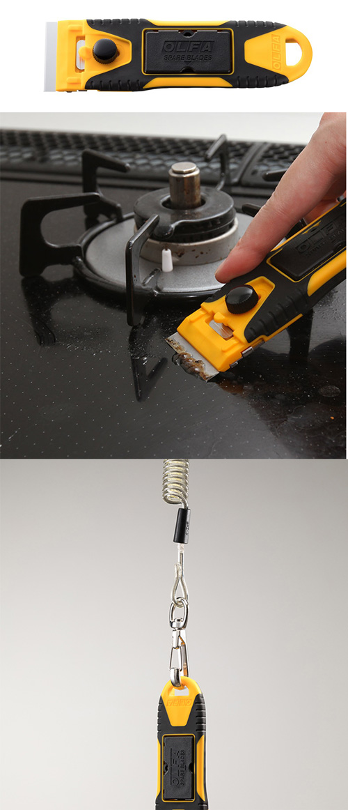 超薄設計抗腐蝕之不銹鋼刀片之刮刀,以水和清潔液可專門來刮除黏著在玻璃表面上的物質。2018年新產品,附六片專用GSR-2S不鏽鋼刮刀刀片。