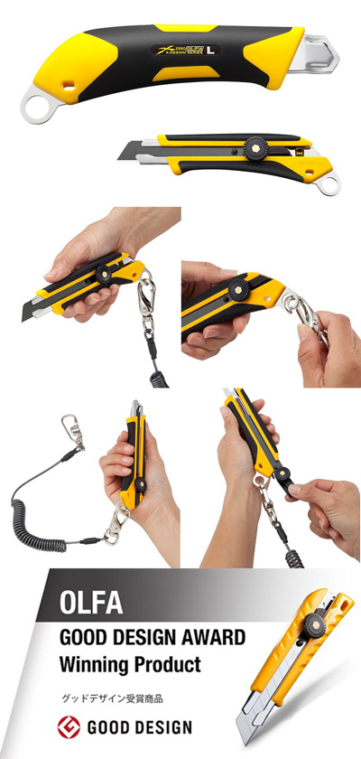 OLFA先進X設計之超舒適抗滑握把大型美工刀,裝配LBB刀片。刀尾附有可掛繫繩之堅固金屬環。刀片鎖固採旋鈕式。 產品特色 : | |