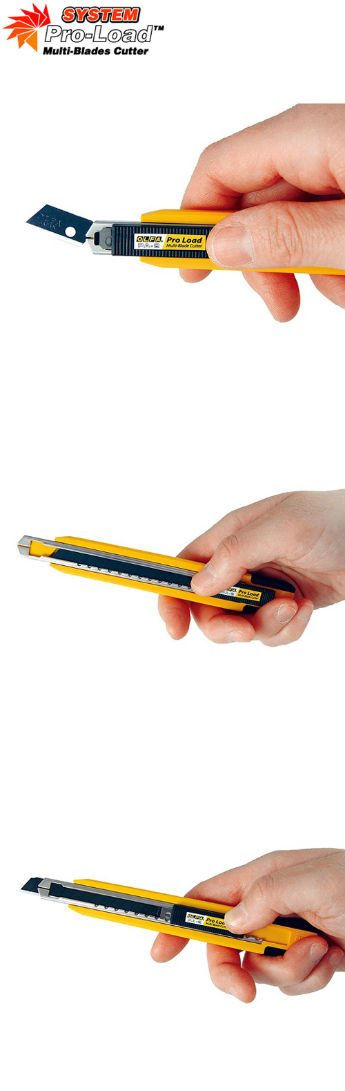 專業級小型美工刀,可內收5片刀片。第一片使用完後拉出,第二片可自動彈出立即使用,節省更換刀片時間。使用一般之小型美工刀片ASB-10 、AB-50、ASBB-10 、ABB-50、AB-10S(不鏽鋼)、AB-SOL-50(無分截)。