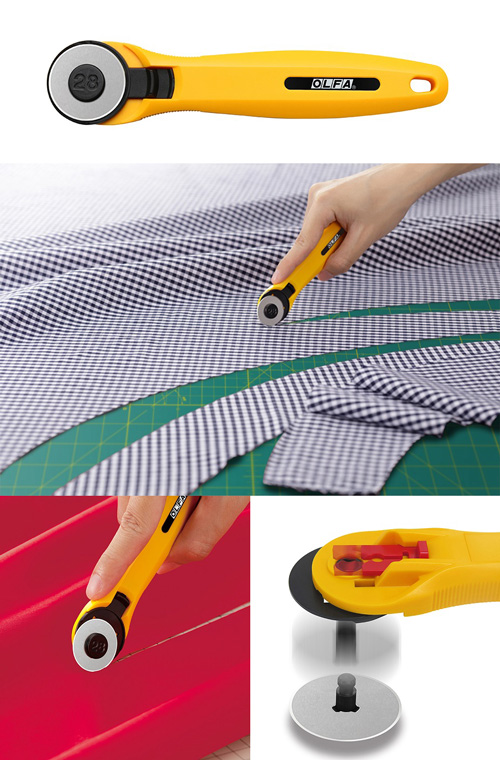 刀片更換快速,左右手皆適用,安全性高之裁布刀,極適合用在拼布。使用28m/m直徑 RB28型刀片。用於布、膠片、薄紙。