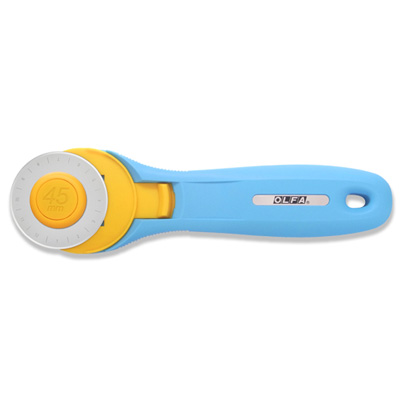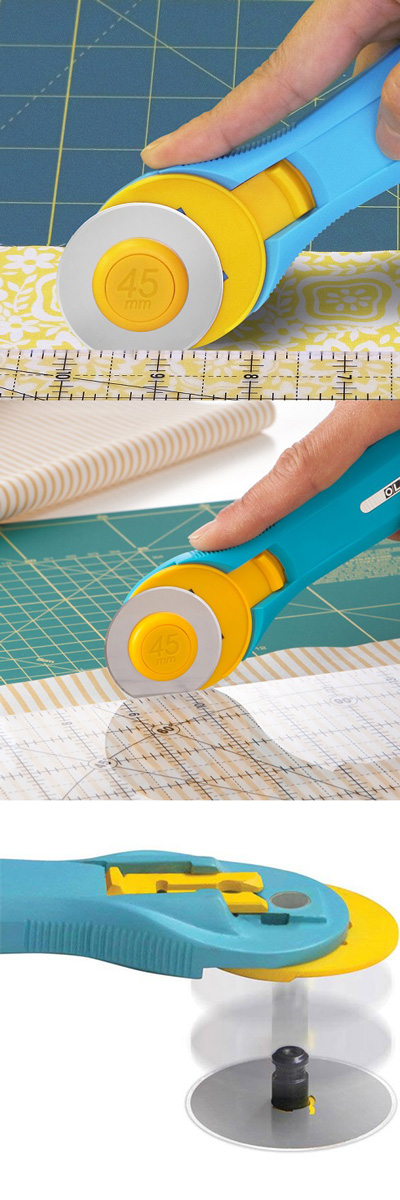 刀片更換快速,左右手皆適用,安全性高之裁布刀,極適合用在拼布。使用45m/m直徑 RB45型刀片。