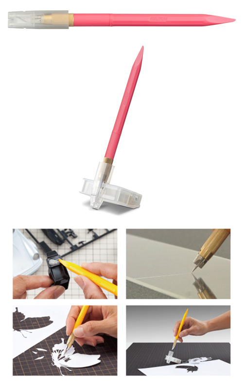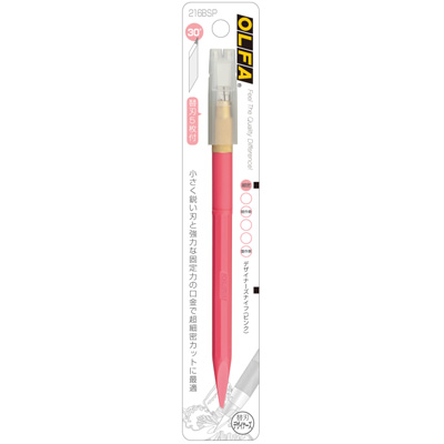 擁有30度角尖形刀片及筆狀之握柄,適用於最精確之切割。日本內銷彩色握柄版本、不含多用途刀片盒。本項產品含5片補充刀片,不包含替換刀片盒/盒)。補充刀片盒需另購,含內含KB-5刀片30片及定位針一支;與筆刀蓋合為一體可當成筆刀之立台。握柄末端造型可當成抹刀。