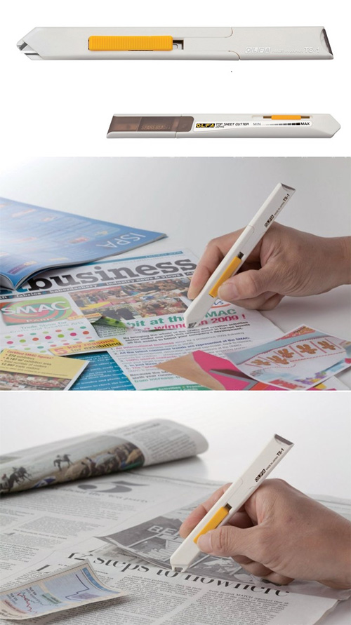 OLFA2011年最新申請專利之「一枚切Top Sheet Cutter」剪報刀TS-1(209B),可應用於雜誌,書報之剪報或賀卡之製作。尺寸約140mm×15mm,重量18公克。替換刀片 : OLFA TSB-1(XB209)型刀片。背面黃色調整鈕可依切割紙張之厚度調整切割之力道。正面黃色滑板可控制刀片之出片與回縮。