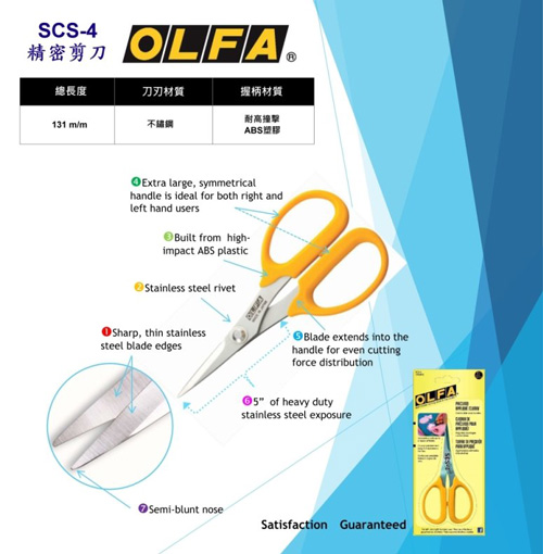 極尖之刀鋒很適合剪比較細小之物品。筆直之刀緣可輕鬆的滑過布料使得剪裁相當乾淨俐落。