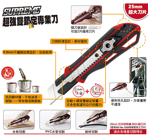 產品特色 :• 自動+螺旋雙鎖定,可承受高達50公斤的壓力• 抗丙酮材質,不怕油漆、樹脂等有機溶劑腐蝕• 刀柄防滑加厚設計,堅固耐用,更好握持• 便利吊孔設計,方便攜帶不遺落;內附1片25mm高硬度美工刀片• 適用SDI No.1520高硬度美工刀片 規格尺寸 :25mm x 125mm