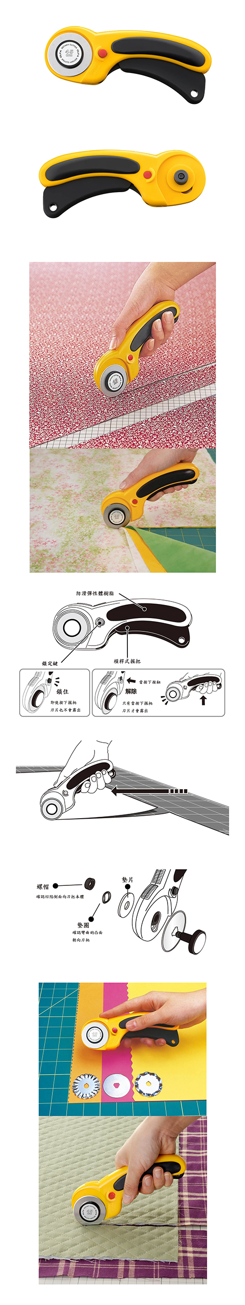 具有安全設計的旋轉刀具,只有握緊手柄時刀片才會彈出。您可以自由地切割難以切割的材料,例如布料、紙張、橡膠板和薄膜。