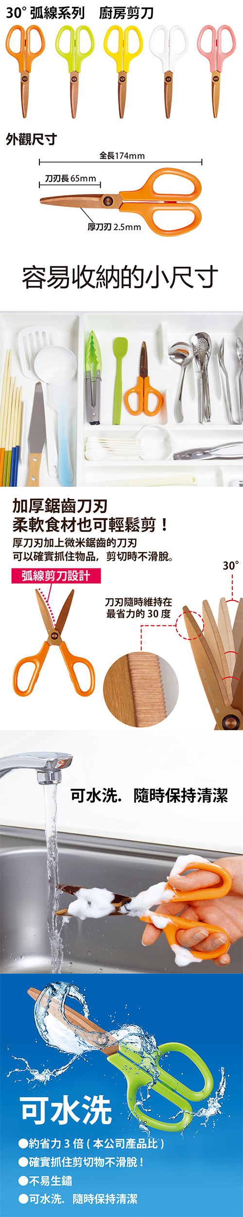 2.刀刃除了加強厚度,還採用鋸齒形,即使柔軟、滑手的食材也可輕鬆剪切。