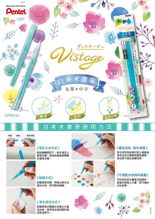 可用於一般水性顏料,筆身裝填自來水,按壓筆身可控制出水量,洗筆換色容易,攜帶方便。