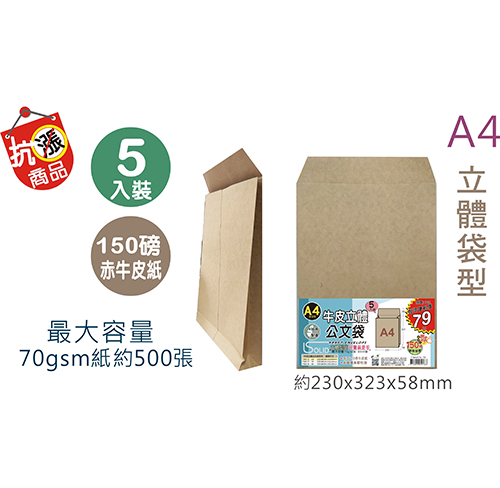 EFFORT 巨匠 A4 150磅 (特價)立體牛皮公文袋/便利袋/牛皮袋 5入 T7002176