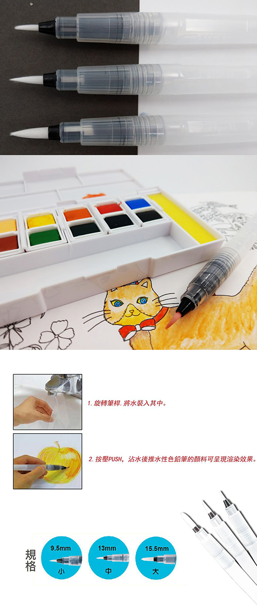 * 適用在水性的顏料,如水性色鉛筆、塊狀水彩、漫畫筆、水彩
