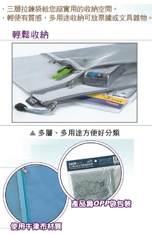 ※三層拉鍊袋,給您超實用的收納空間,多用途,可裝印鑑、證件、信用卡、票據、各種小物品,方便收納好整理。
