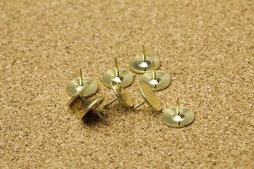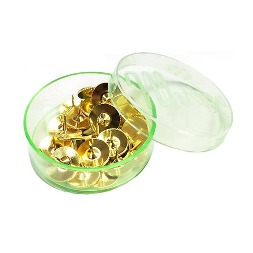 金屬電鍍銅製圖釘,經典金色圓蓋釘子外型,上部圓盤設計非常容易將文件固定在壁面及取下。經過電鍍拋光處理,圖釘不易生鏽,圓蓋弧線順手好拿,釘子長度適中便於固定文件。復古簡約造型熱銷數十年,一般人皆能徒手釘在特定位置,圓蓋和尖端的施力設計能輕鬆將圖釘壓進公佈欄、軟木墊等,以及拔取重複使用。