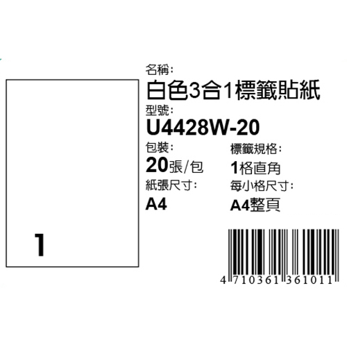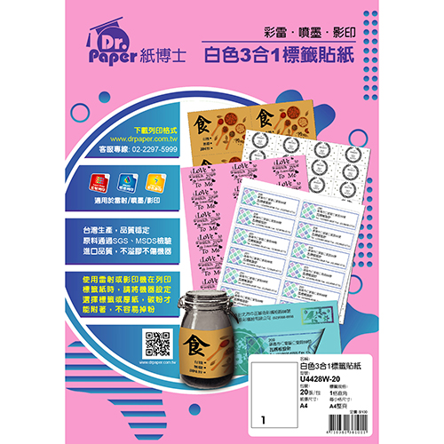 Dr.Paper NO.1-U4428W-20 全張 A4 雷射噴墨影印自黏標籤貼紙/電腦標籤 20大張入